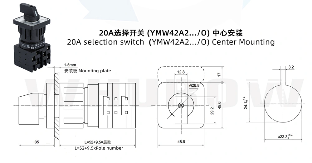 - الموضع المرن وتكوين الطبقة: 20A فتحة مركزية مثبتة على فتحة مركزية متعددة الأوضاع يدعم مفتاح الكامة ما يصل إلى 12 موضع تشغيل و1 إلى 12 طبقة تبديل، والتي يمكن تخصيصها وفقًا للاحتياجات الفعلية للمعدات لتلبية سيناريوهات التحكم المعقدة.