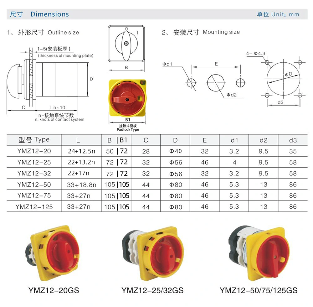 تم تصميم مفتاح الكاميرا المجمع ذو الوضعين بقفل 32 أمبير (الطراز الداخلي: YMZ12‑32GS) للأنظمة الكهربائية بتردد 50 هرتز، مع جهد مقنن يصل إلى 690 فولت تيار متردد و240 فولت تيار مستمر، وتيار مقنن 32 أمبير.