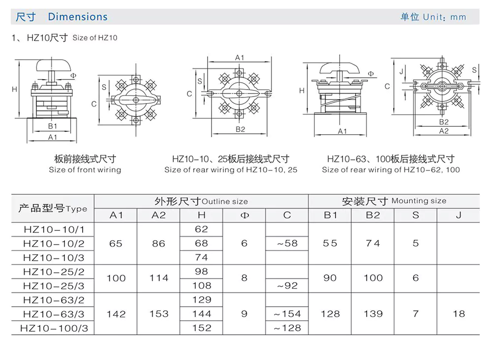 يعمل تركيب HZ10-100E119 أمام اللوحة 100 أمبير عند 50 هرتز تيار متردد، ويدعم الفولتية المقدرة بـ 380 فولت تيار متردد و220 فولت تيار مستمر مع تيار مقدر 100 أمبير. تم تصميمه للتشغيل اليدوي والعرضي، فهو يقوم بتبديل وكسر وتحويل الأحمال المختلطة المقاومة والحثية، ويتحكم بشكل موثوق في محركات التيار المتردد الصغيرة.